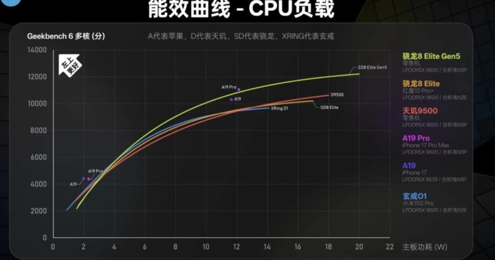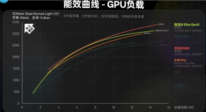 并且综合能效超越天玑9500,只可惜依旧全功率段被苹果A19Pro压制。