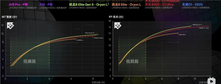 也就是说,3W之前的低频段,不管是两款新旗舰SoC性能都是和前代基本一致!