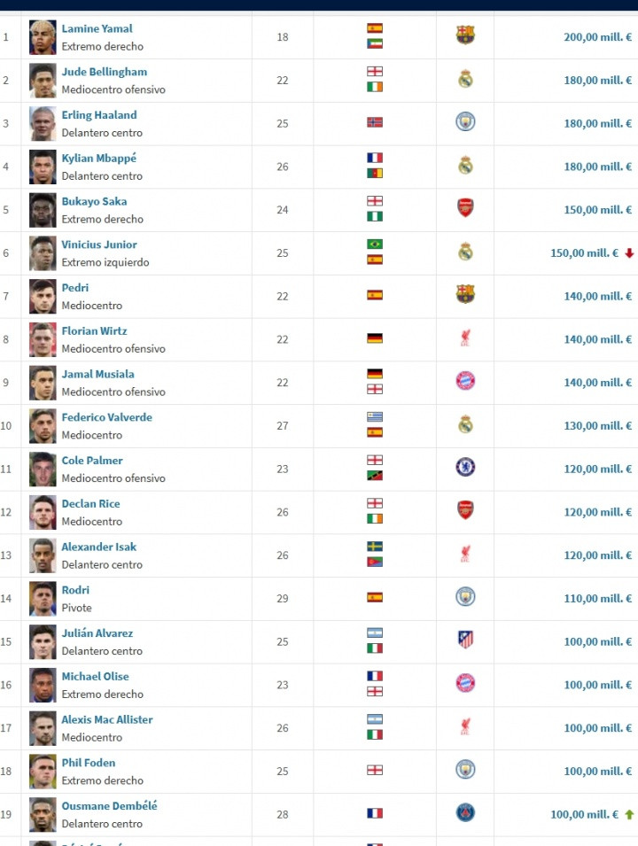 皇马:贝林厄姆1.8亿、姆巴佩1.8亿、维尼修斯1.5亿、巴尔韦德1.3亿